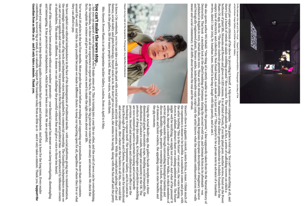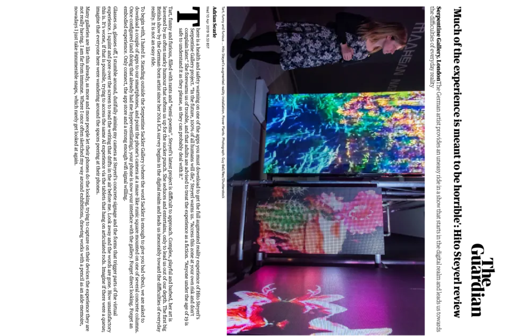 Steyerl’s new project for the Serpentine Galleries considers power and inequality in society, mapping unequal wealth distribution in the communities surrounding the Serpentine which has been recorded as one of the most socially uneven areas in Europe. Visitors to the exhibition will see an augmented reality app designed to expand our social vision of some local communities to reveal what Steyerl calls Actual Reality, a series of guided neighborhood ‘power walks’, and a new video installation created using artificial intelligence trained to predict the future. Beginning with the premise that ‘’’power’’ is the necessary condition for any digital technology’, Steyerl considers the multiple meanings of the word, including electrical currents, the ecological powers of plants or natural elements, and the complex networks of authority that shape our environments.