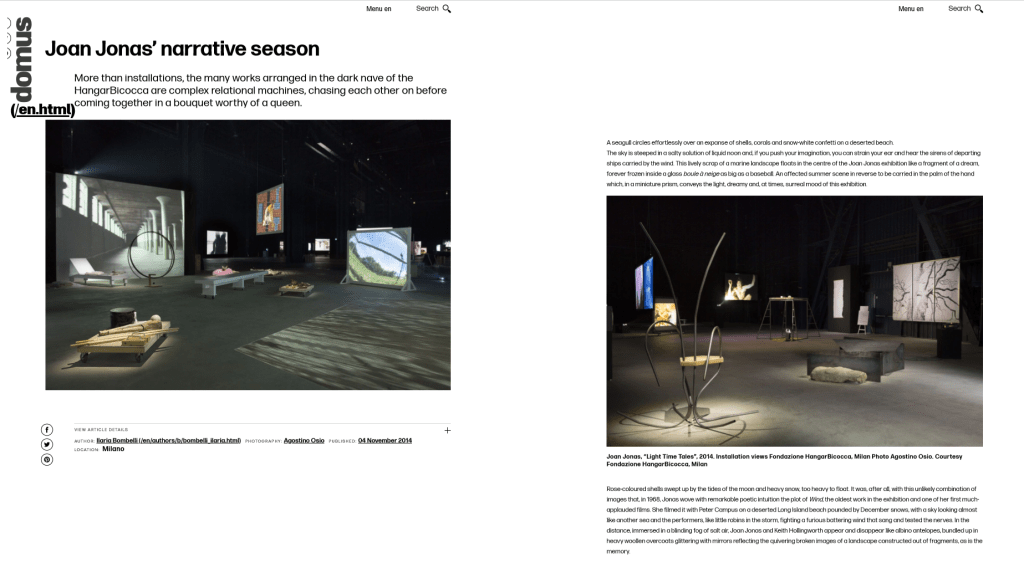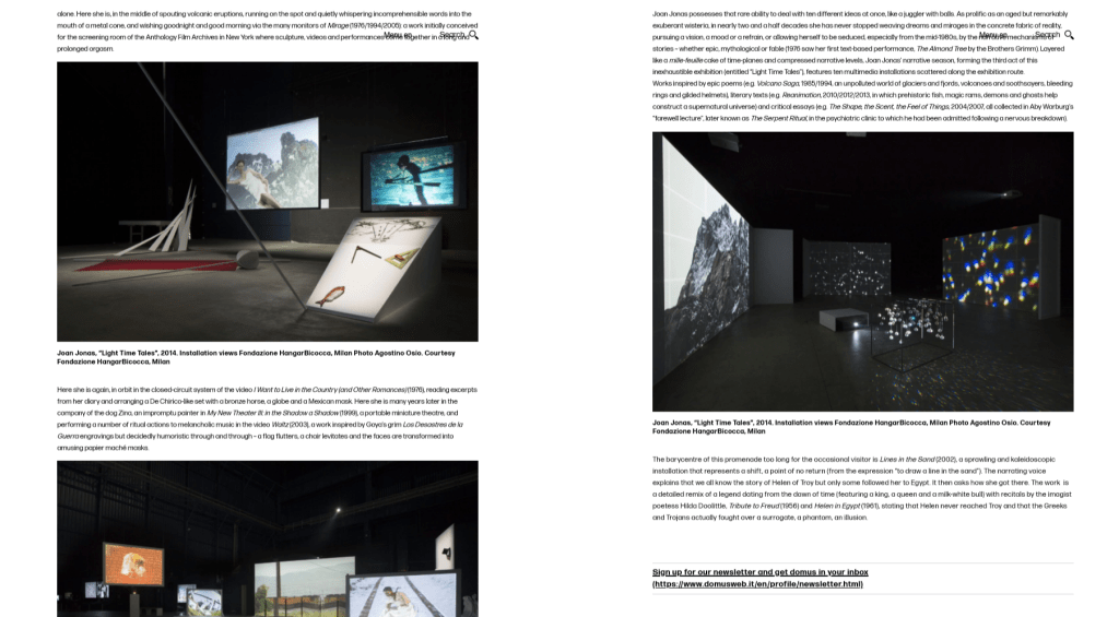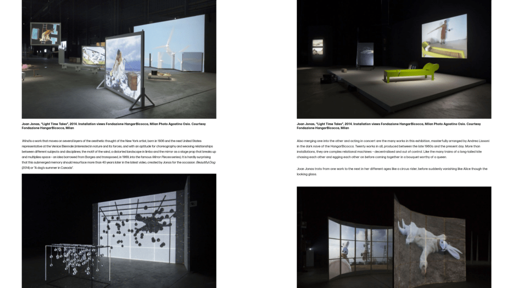 Jonas works as a Performance artist, but within this realm she incorporates drawing, dance, noise, video, travel, and at the same time introduces various sculptural objects, photographs, and props. She also interweaves a plethora of literary sources, including poems, myths, and fairytales, and as such, presents a highly complex and multi-layered private imaginative world to a public audience. The result is not usually simple, and often viewers feel overwhelmed, as though they cannot grasp any sense of linear narrative in the artist’s work. This is the honesty and integrity of a Jonas piece; she exposes without restraint that the self is fragmentary, anxious, and ultimately nonsensical. Since the early 1960s, and still today, albeit now with more institutional support, Jonas continues to examine her own identity, often in relation to other artists, cultural rituals, gender equality, societal gaze, and contemporary politics.
