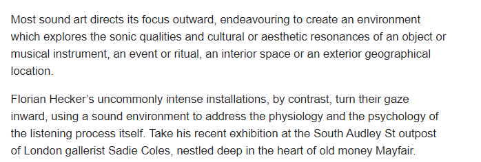 What I like about this work in particular in how Hecker explores how sound waves travel through the space and manipulates it to fill the gallery space. Using curved mirrors, the synthetic sounds are reflected and diverted around the room, ‘thus heightening the complexity of the sound installation’. He creates a sound/ space experience -‘constantly changing perceptions of space, the body and themselves’.