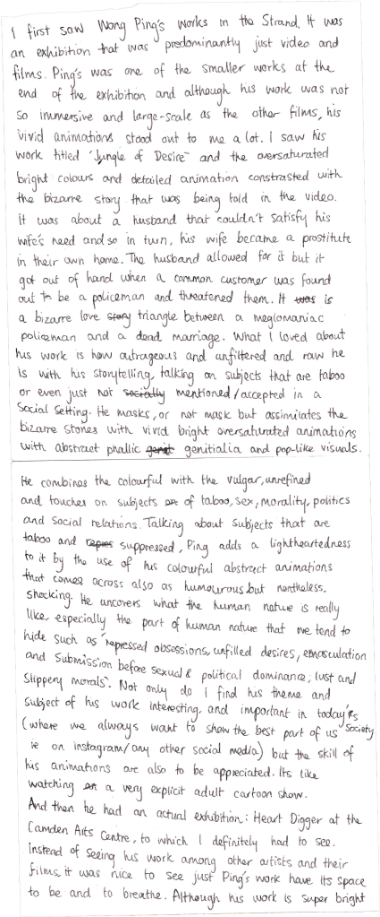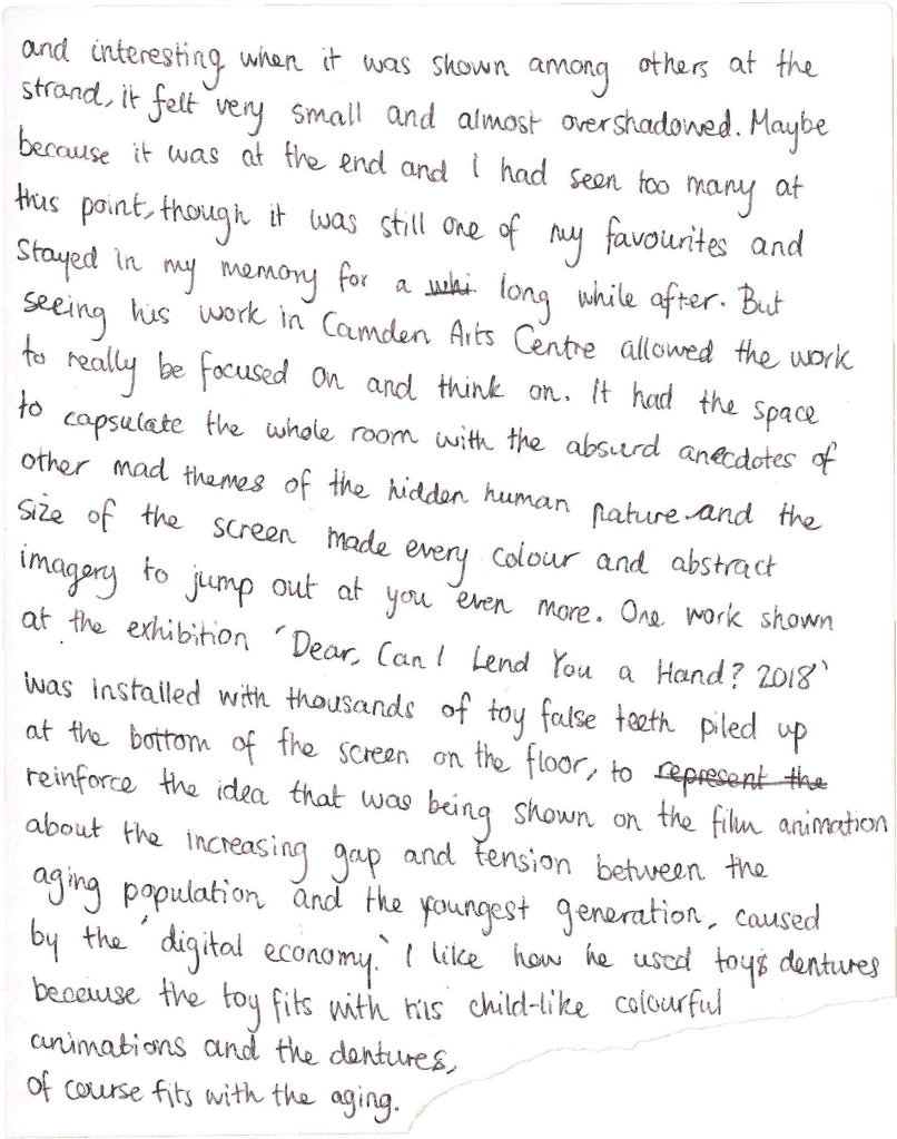 I like this work because of the comparisons and the logical thinking that Lawrence Abu Hamdan has put into this work. For example, the fact that this is a representation of ear-witness evidence that has been collected and presented it in an archival ‘inventory’ way to further support that idea. I also like the visual objects of the audio description that the ear-witnesses describe and how it is displayed as an installation. So that we can link/ relate the objects to the sound described. It focuses and highlights on the language surrounding sounds/ audio and explores that ambiguity. Like how when describing a gunshot to a sound that we can relate to is “somebody dropping a rack of trays”. It juxtaposes from the violent act & audio of a gunshot when compared to a rack of trays. This theme of ear witnesses is applied to Saydnaya (2017) which is an audio investigation into the Syrian regime prison of Saydnaya. Its estimated that 13,000 people have been executed in Saydnaya since 2011 and the prisoners are kept in darkness, having only their hearing as their most relied sense, making up most of their memories & recollections of the place as audio memories. The work oscillates between the former prisoner’s testimonies and their reenacted whispers as sonic evidence. I think this work is important and valuable in telling the witnesses stories and revealing the harsh conditions of the prison as well as exploring the significance of sound / audio is. Art has predominantly been visual for all of its existence and though sound is just now getting recognition, I think people forgot how hearing/ sound/ audio plays a big part in our life. Saydnaya (2017) shows. how sometimes audio is better in recollecting/representing memories than visual imagery.