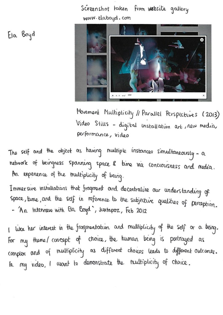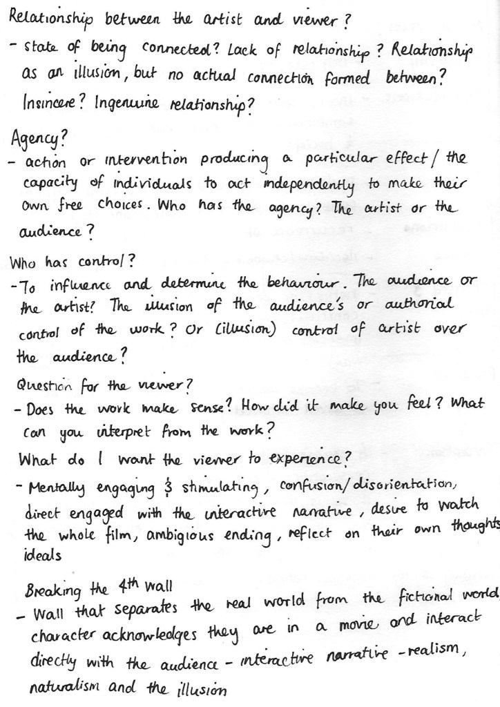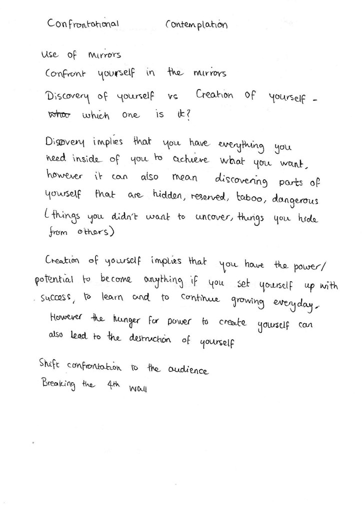 With this project, I would like to further develop the theme. My work currently talks about identity as a whole and the illusion of control. At the moment, I find the theme to be vague (my own doing) and as I said previously, I would want to be more vulnerable and specific. This means to be more particular in the aspect of identity, and maybe to explore how we try to control them. Aspects of identity I’m interested in and would want to explore is my cultural identity, and how relationships affect identity or how identity is built within a relationship. For development, I would want to put together another film, with more experimental filming techniques and within different settings. I would also explore audio more. In regards to me work, I would like to explore dual audio and experiment with how sound influences the concept.