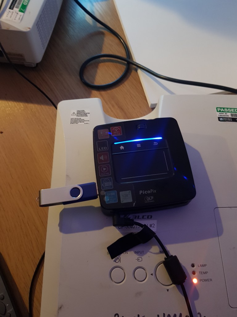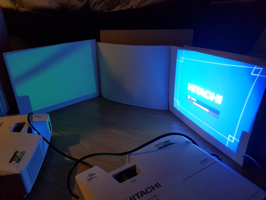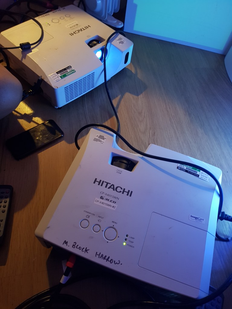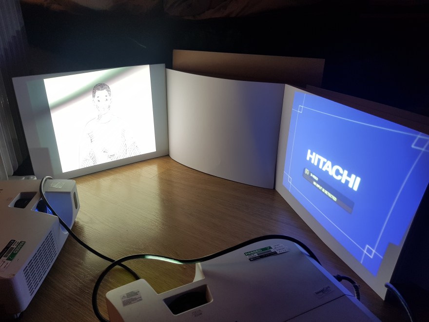 I stumbled across many problems when setting up the small scale model, the main one being that I was lacking a hdmi to usb converter, which meant that I couldn’t use one of the big projectors. TO counteract this, I ended up uploading one of the projection videos onto my phone and playing that in time with the projectors. In the end, I used one HITACHI projector, a mini-projector and a phone screen.